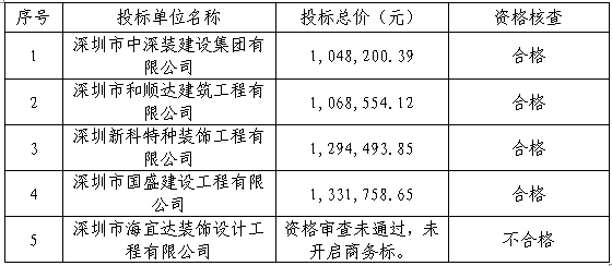 乐鱼大厦19层总部办公室改造装修工程于2019年1月22日在中国招标投标公共服务平台、深圳国际招标采购网、深国招电子交易系统等网站发布招标公告进行公开招标,招标控制价为139.75万元。在投标截止时间2019年2月25日内共有5家单位递交了投标文件。评标委员会根据招标文件既定评标办法(经评审的最低投标价法)推荐排名第一的投标单位为中标候选人。现中标结果已报集团招投标领导小组审议确认,特此公示如下: