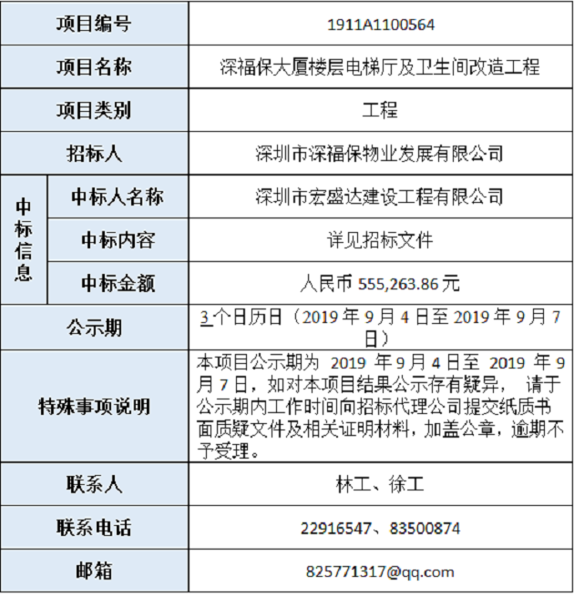 经深圳市国际招标有限公司组织招标的乐鱼大厦楼层电梯厅及卫生间改造工程已完成评审,现将本项目评审的相关情况及结果进行公示,具体内容如下: