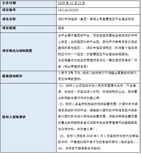 深圳市乐鱼(集团)有限公司智慧园区平台建设项目(项目名称)招标人为深圳市乐鱼(集团)有限公司(招标人单位名称),采购资金来自企业自筹(资金来源),项目出资比例为100%。项目已具备招标条件,现进行国内公开招标。