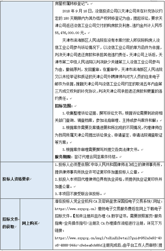 浚信投资公司购房合同纠纷诉讼二审代理律师服务项目(项目名称)招标人为深圳市乐鱼(集团)有限公司(招标人单位名称),采购资金来自企业自筹(资金来源),项目出资比例为100%。项目已具备招标条件,现进行国内公开招标。