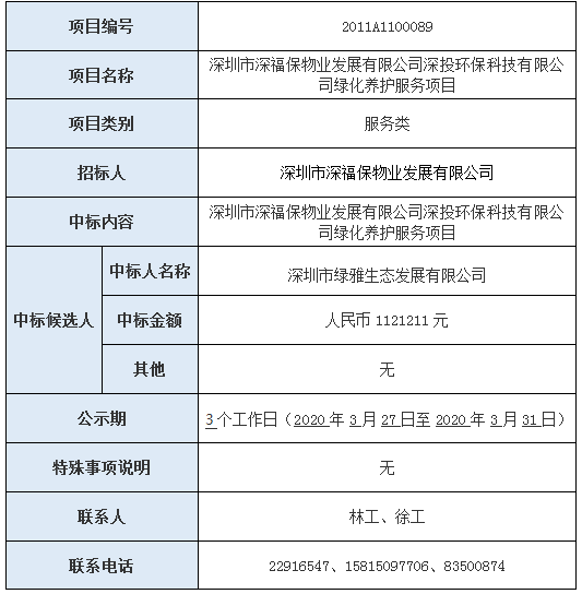 经深圳市国际招标有限公司组织招标的深圳市乐鱼物业发展有限公司深投环保科技有限公司绿化养护服务项目已完成评审,现将本项目评审的相关情况及结果进行公示,具体内容如下: