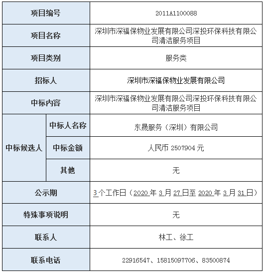 经深圳市国际招标有限公司组织招标的深圳市乐鱼物业发展有限公司深投环保科技有限公司清洁服务项目已完成评审,现将本项目评审的相关情况及结果进行公示,具体内容如下: