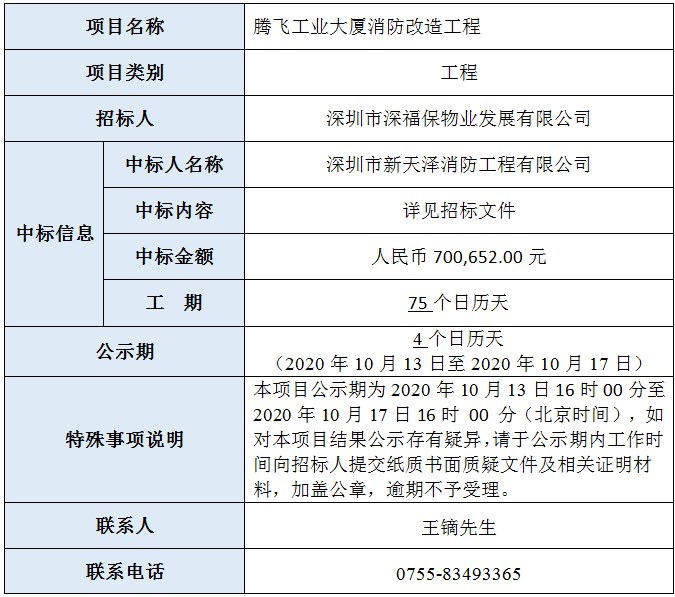 腾飞工业大厦消防改造工程(招标编号:SZXJCG-S202009180004)已完成评审,现将本项目评审的相关情况及结果进行公示,具体内容如下: